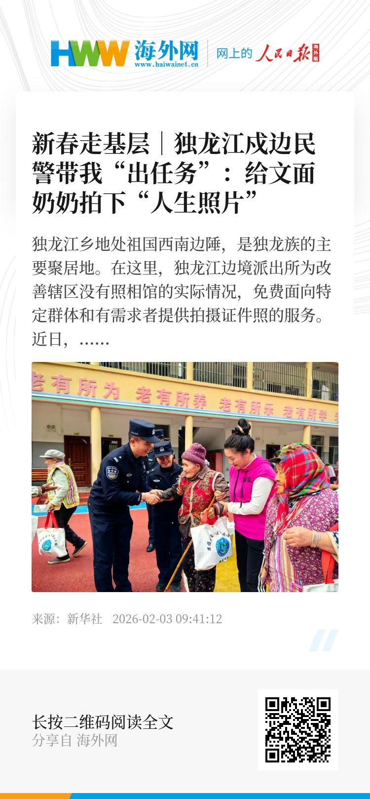 近日,新华社记者跟随独龙江戍边民警出了一次“任务”,给独龙江乡的文面奶奶拍照,而这次拍摄,也让记者有了新的发现……