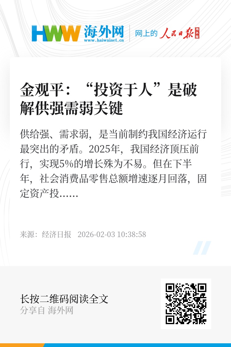 综合来看,破解供强需弱矛盾,重点在于调整公共资源配置的思路,从对物的重视转向对人的投资。面向“十五五”,“坚持投资于物和投资于人紧密结合”,是党中央提出的明确要求。在此基础上,还需协同推进扩大内需、优化供给与深化改革,让大国经济内部可循环的优势得到真正释放。