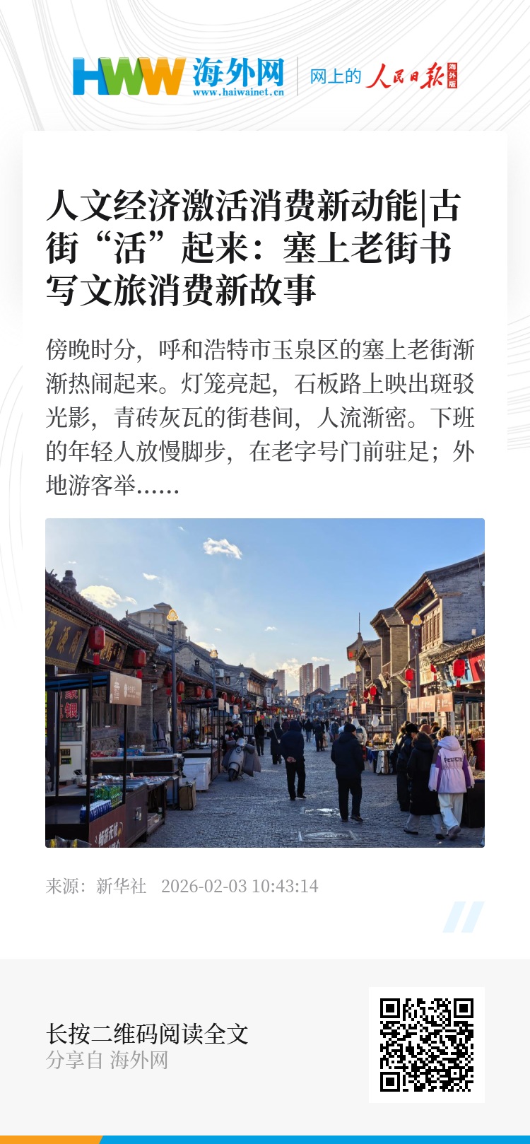 为了保持吸引力,塞上老街围绕各大节庆节点,策划推出主题市集、非遗展示、夜游活动,让老街呈现出不同面貌。2025年12月31日跨年夜,塞上老街上演了《又见昭君》高空秀、阁楼主题音乐会等精彩节目。“街区近年来持续引入新兴业态,发展首店经济和夜间经济,通过不断更新内容,营造更具参与感和沉浸感的游览氛围。”郭毓介绍。数据显示,2025年塞上老街共接待游客约2229万人次,实现旅游收入4.41亿元。