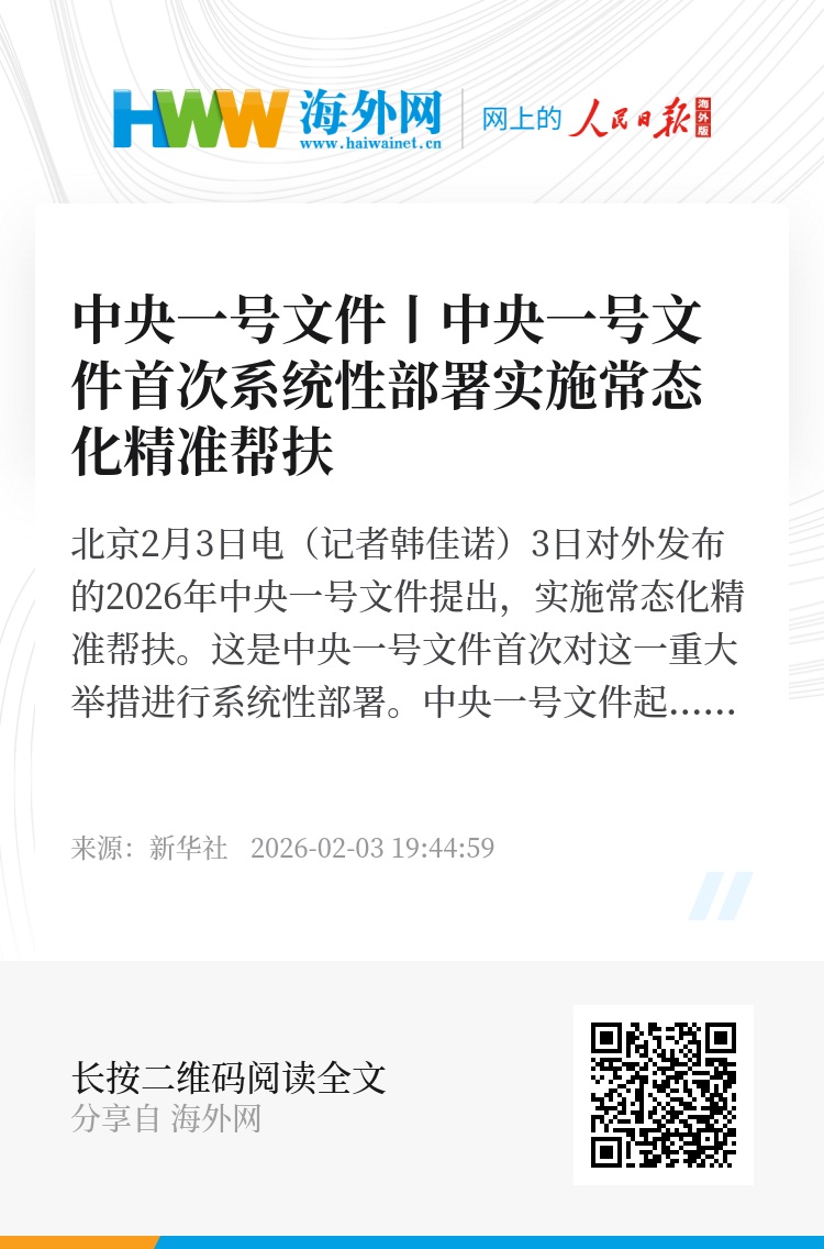 新华社北京2月3日电(记者韩佳诺)3日对外发布的2026年中央一号文件提出,实施常态化精准帮扶。这是中央一号文件首次对这一重大举措进行系统性部署。