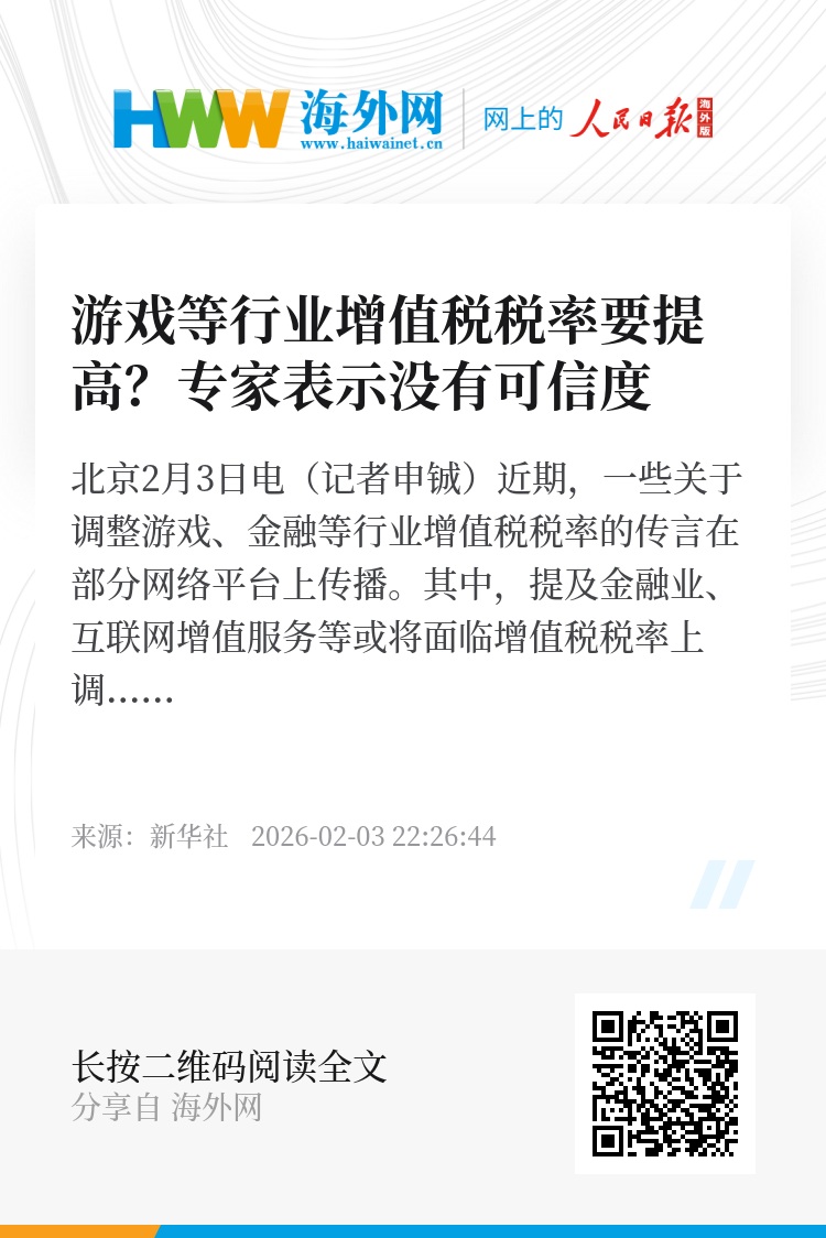 新华社北京2月3日电(记者申铖)近期,一些关于调整游戏、金融等行业增值税税率的传言在部分网络平台上传播。其中,提及金融业、互联网增值服务等或将面临增值税税率上调,游戏行业的税率有可能从6%调高至32%。