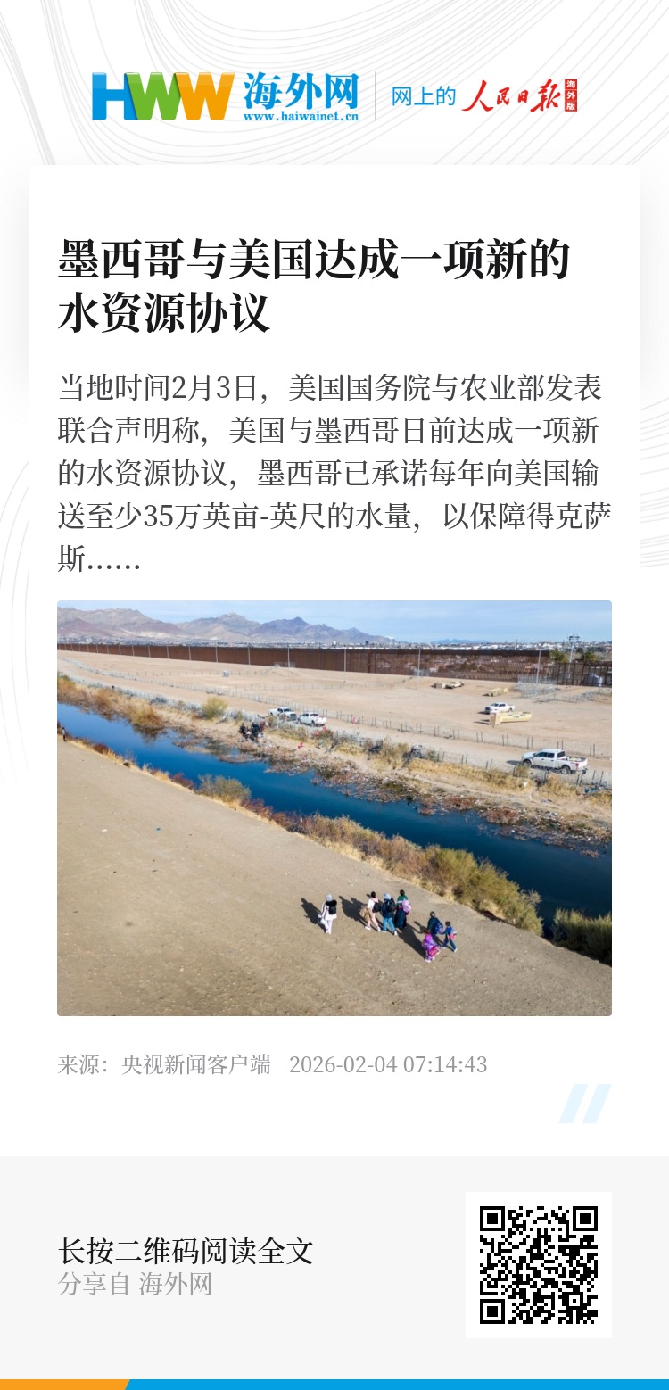 当地时间2月3日,美国国务院与农业部发表联合声明称,美国与墨西哥日前达成一项新的水资源协议,墨西哥已承诺每年向美国输送至少35万英亩-英尺的水量,以保障得克萨斯州南部农业关键水资源。墨方还承诺制定详细计划,全面偿还上一周期累积的全部用水欠账。