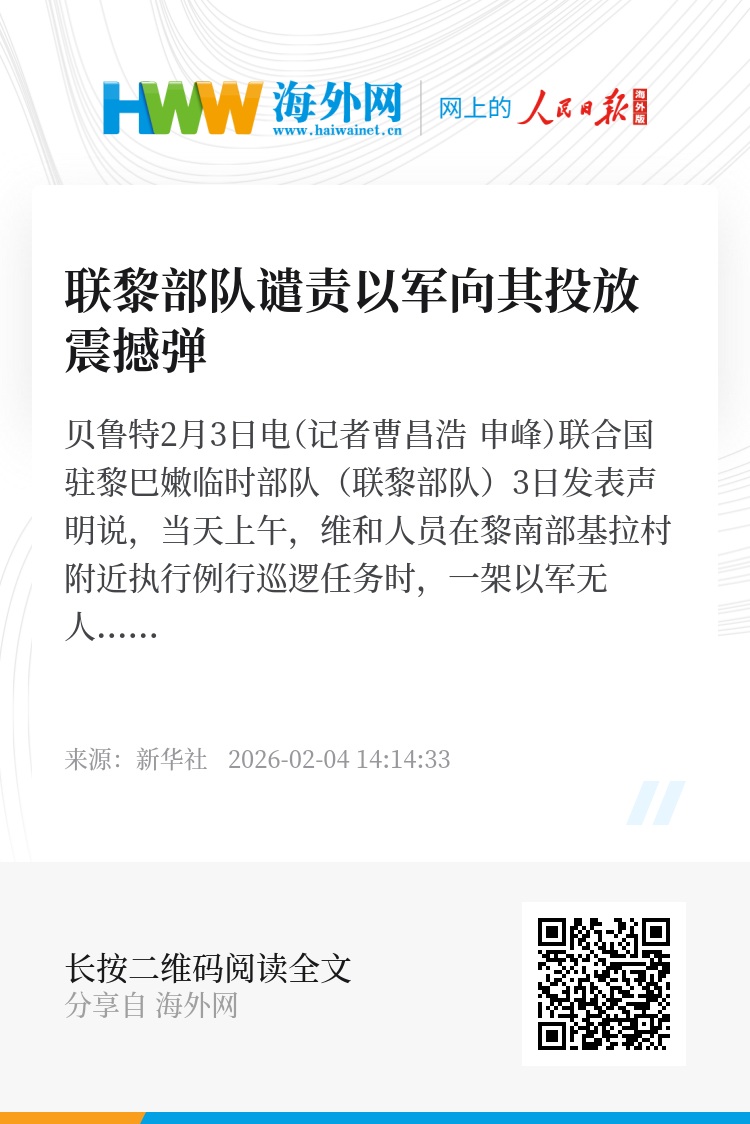 新华社贝鲁特2月3日电(记者曹昌浩 申峰)联合国驻黎巴嫩临时部队(联黎部队)3日发表声明说,当天上午,维和人员在黎南部基拉村附近执行例行巡逻任务时,一架以军无人机在其上空投下震撼弹,所幸未造成人员伤亡。