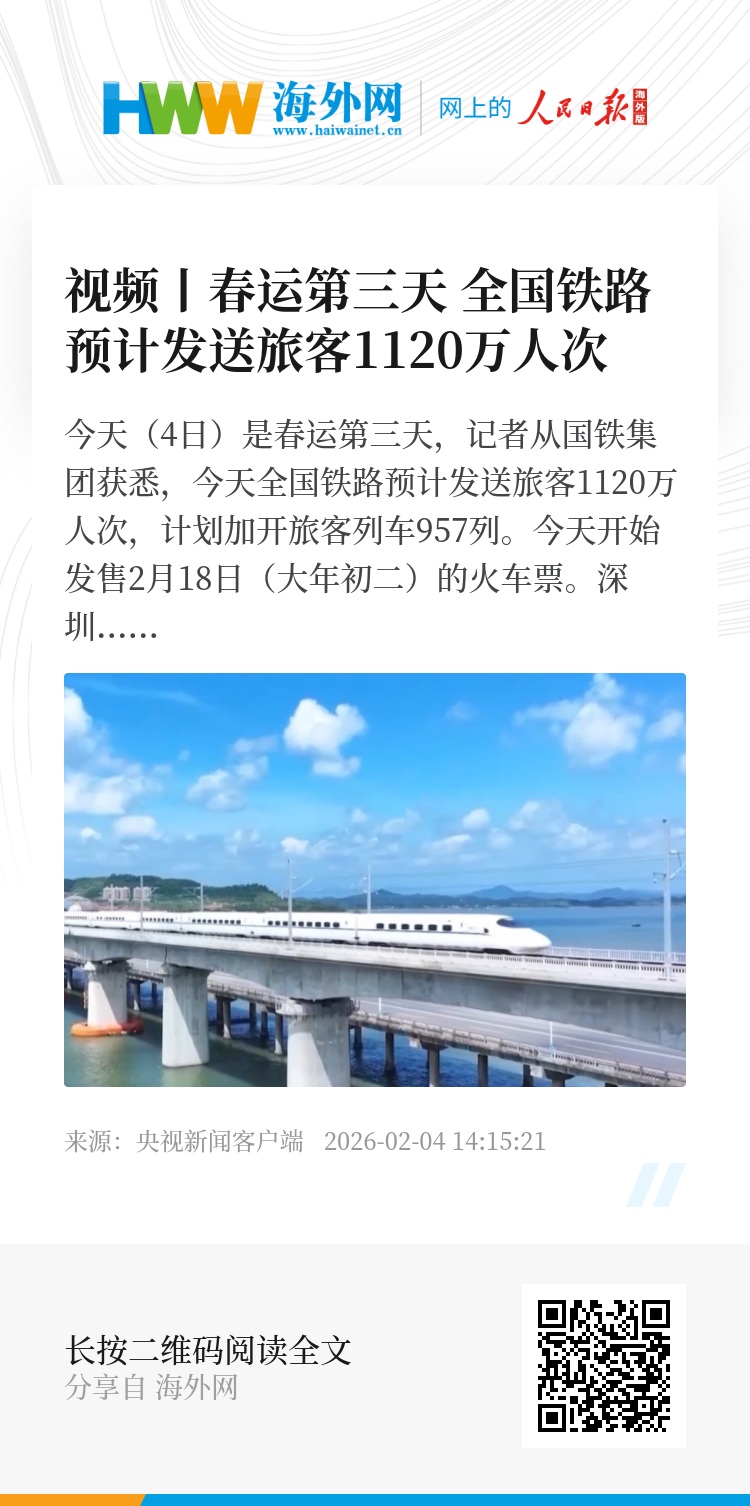 今天(4日)是春运第三天,记者从国铁集团获悉,今天全国铁路预计发送旅客1120万人次,计划加开旅客列车957列。今天开始发售2月18日(大年初二)的火车票。深圳至香港,广州至武汉、重庆,北京至哈尔滨等热门区间客流相对集中。