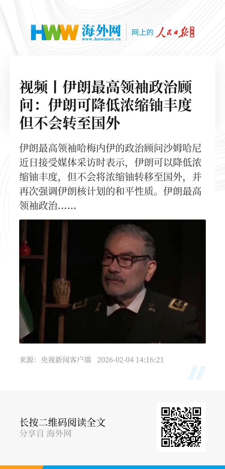 伊朗最高领袖政治顾问 沙姆哈尼:例如,伊朗可以将浓缩铀丰度从60%降低至20%,浓缩铀可以被稀释。如果你担心60%的丰度,那么它是可以被稀释的,但这是需要付出代价的。美国必须为此付出代价,既然担心的根本问题能够得到解决,就没有理由将浓缩铀运往国外。