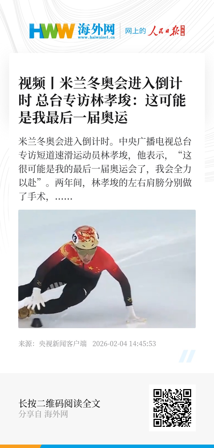 米兰冬奥会进入倒计时。中央广播电视总台专访短道速滑运动员林孝埈,他表示,“这很可能是我的最后一届奥运会了,我会全力以赴”。两年间,林孝埈的左右肩膀分别做了手术,术后三个月就恢复了训练,克服伤痛,状态强势反弹。