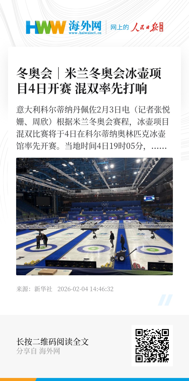新华社意大利科尔蒂纳丹佩佐2月3日电(记者张悦姗、周欣)根据米兰冬奥会赛程,冰壶项目混双比赛将于4日在科尔蒂纳奥林匹克冰壶馆率先开赛。