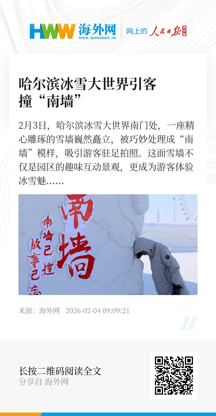 2月3日,哈尔滨冰雪大世界南门处,一座精心雕琢的雪墙巍然矗立,被巧妙处理成“南墙”模样,吸引游客驻足拍照。这面雪墙不仅是园区的趣味互动景观,更成为游客体验冰雪魅力的独特窗口。图源:视觉中国