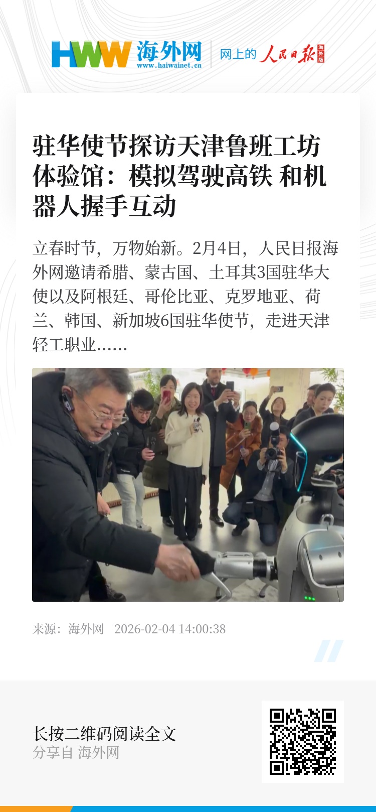 立春时节,万物始新。2月4日,人民日报海外网邀请希腊、蒙古国、土耳其3国驻华大使以及阿根廷、哥伦比亚、克罗地亚、荷兰、韩国、新加坡6国驻华使节,走进天津轻工职业技术学院,参观鲁班工坊体验馆、精密模具与智能制造产教融合基地。驻华使节们和机器人握手互动,体验模拟高铁驾驶教学项目,观摩留学生教学实践,为鲁班工坊技能培训成果点赞。