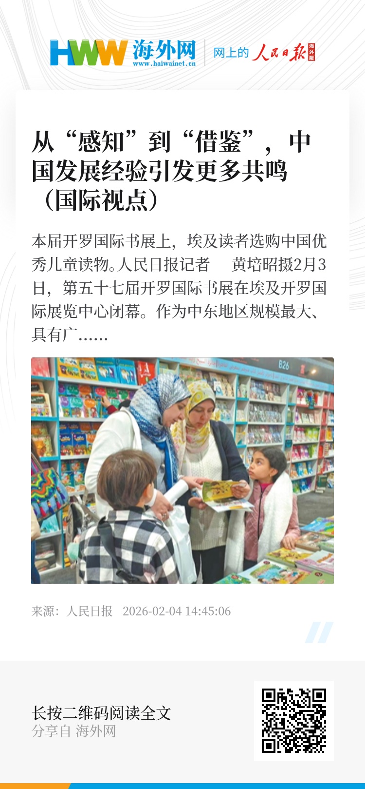 从好奇探寻到主动借鉴,从感知文化到学习经验,开罗国际书展反映出埃及读者对中国认知的不断深化。这种转变背后,是中埃两国发展需求的契合与合作意愿的升温。