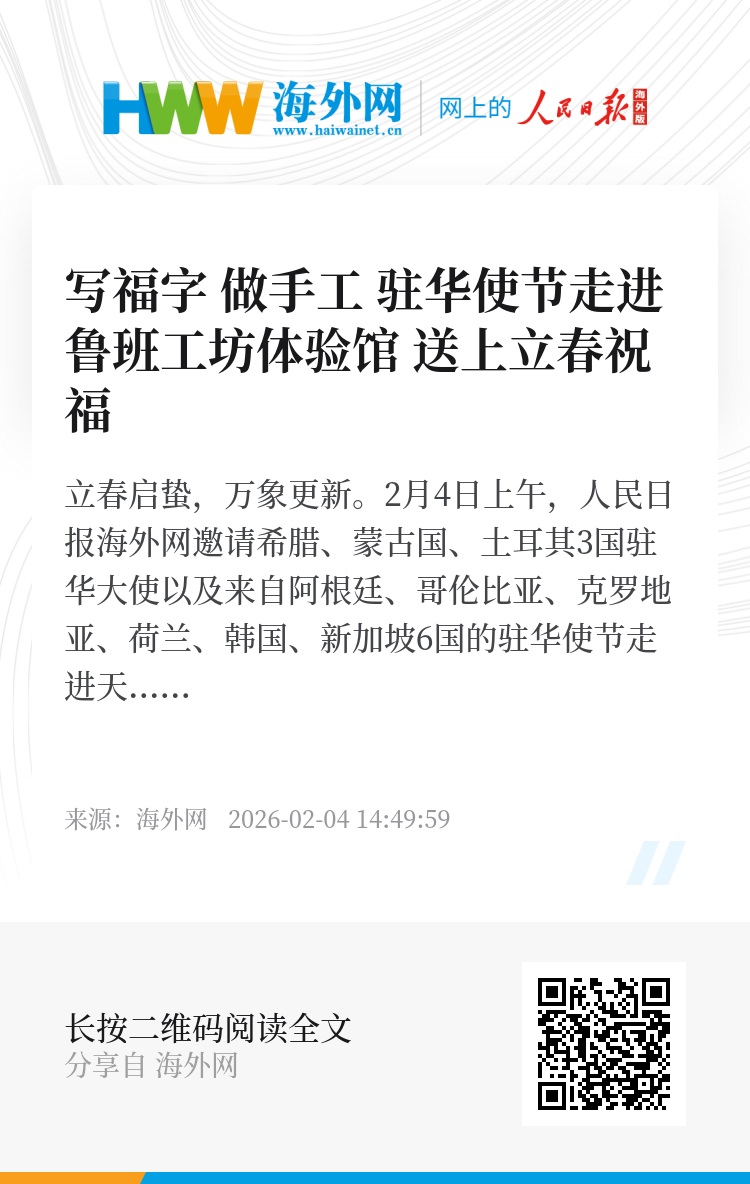 立春启蛰,万象更新。2月4日上午,人民日报海外网邀请希腊、蒙古国、土耳其3国驻华大使以及来自阿根廷、哥伦比亚、克罗地亚、荷兰、韩国、新加坡6国的驻华使节走进天津轻工职业技术学院,参观鲁班工坊体验馆,体验写福字、做手工,送上立春祝福。