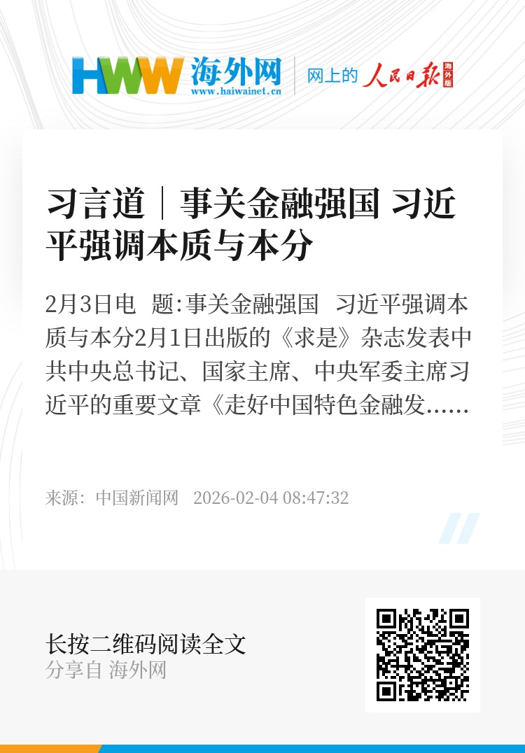 2月1日出版的《求是》杂志发表中共中央总书记、国家主席、中央军委主席习近平的重要文章《走好中国特色金融发展之路,建设金融强国》。