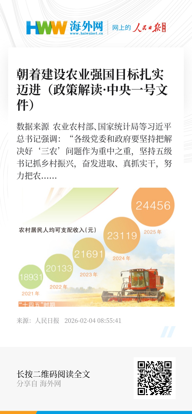 中共中央、国务院《关于锚定农业农村现代化、扎实推进乡村全面振兴的意见》公开发布。这是党的十八大以来指导“三农”工作的第十四个中央一号文件,对2026年“三农”工作作出全面部署,充分体现了以习近平同志为核心的党中央对“三农”工作一以贯之的高度重视。