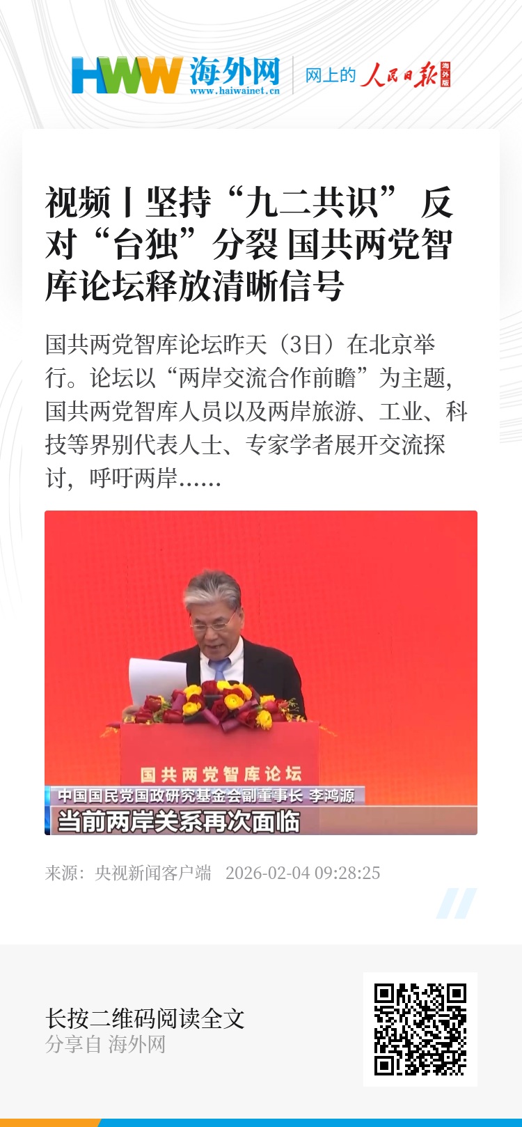 中国国民党国政研究基金会副董事长 李鸿源:2016年民进党上台以来,台海形势复杂严峻,当前两岸关系再次面临何去何从的重要抉择。两岸同胞要团结起来,坚持“九二共识”,反对“台独”分裂跟外来干涉,维护台海和平,加强交流合作,致力民生改善,携手共创中华民族复兴伟业。
