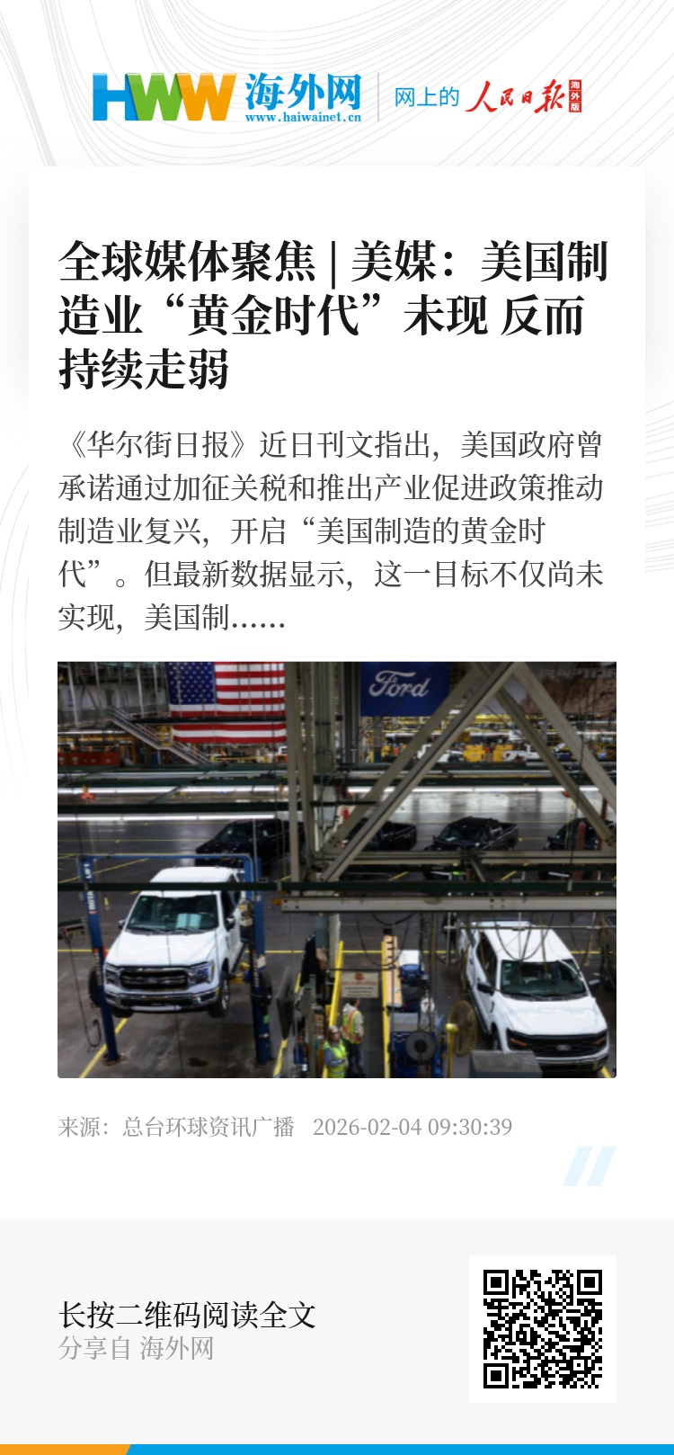 《华尔街日报》近日刊文指出,美国政府曾承诺通过加征关税和推出产业促进政策推动制造业复兴,开启“美国制造的黄金时代”。但最新数据显示,这一目标不仅尚未实现,美国制造业的整体态势反而持续走弱。