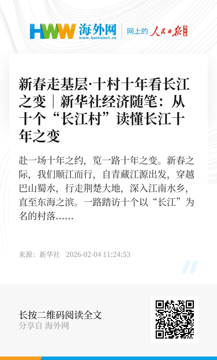 “十五五”开局之年,气象一新的大江南北,春潮涌动、蓄势待发。“持续推进长江经济带发展”,“十五五”规划建议中的明确部署,让人们对母亲河的未来更加满怀憧憬与期许。从十个村看未来,我们坚信,只要久久为功、持续发力,源远流长的母亲河,必将在生生不息中激荡起江河哺育人民、人民守护江河、人水和谐共生的时代乐章。(记者孙爱东、史卫燕)