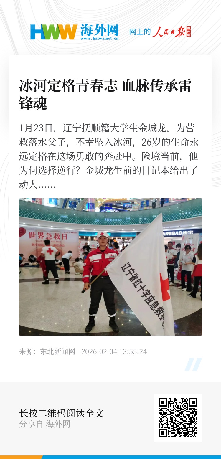 1月23日,辽宁抚顺籍大学生金城龙,为营救落水父子,不幸坠入冰河,26岁的生命永远定格在这场勇敢的奔赴中。