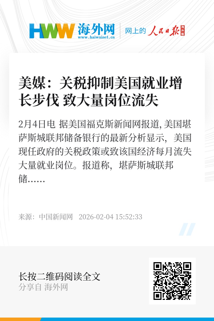 中新网2月4日电 据美国福克斯新闻网报道,美国堪萨斯城联邦储备银行的最新分析显示,美国现任政府的关税政策或致该国经济每月流失大量就业岗位。