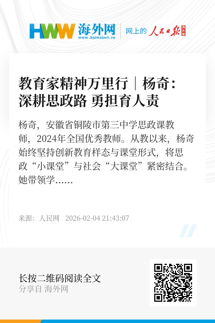 杨奇说,她将继续用“行走的思政课”厚植家国情怀,铺就学生成长底色。积极践行教育家精神,答好“为党育人、为国育才”的时代答卷。
