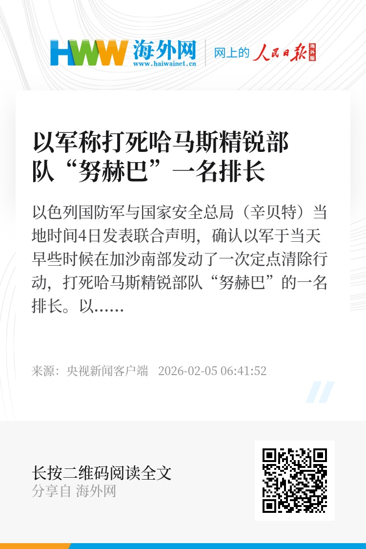 以色列国防军与国家安全总局(辛贝特)当地时间4日发表联合声明,确认以军于当天早些时候在加沙南部发动了一次定点清除行动,打死哈马斯精锐部队“努赫巴”的一名排长。