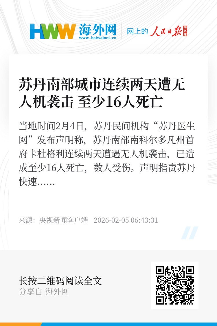 声明指责苏丹快速支援部队2月3日和4日连续出动无人机,针对卡杜格利多处目标实施空袭,其中包括两处医疗设施,造成严重人员伤亡。声明还表示,在经历长期围困后,卡杜格利约一半的医疗卫生设施已停止运转,医疗资源极度紧张。对于该声明,快速支援部队暂未回应。