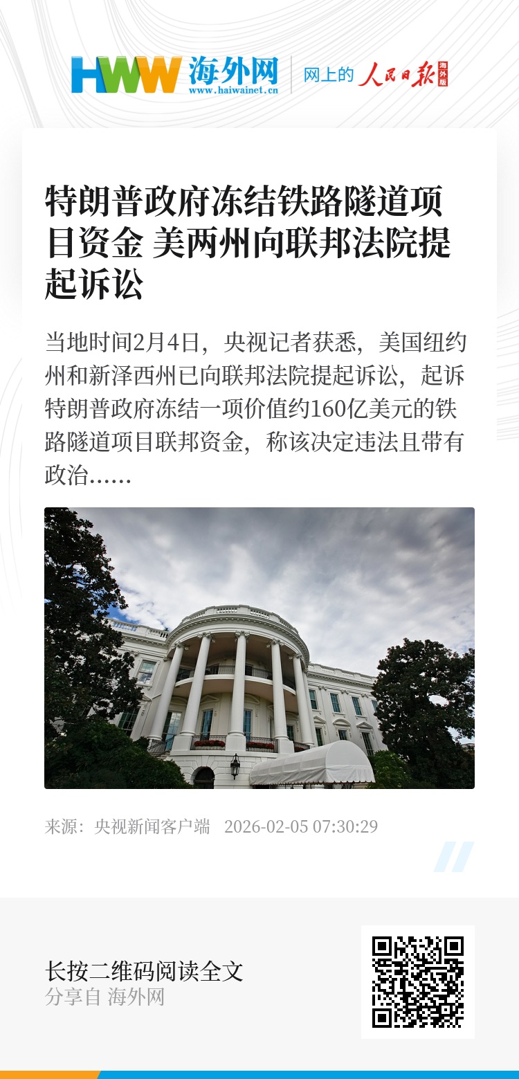当地时间2月4日,央视记者获悉,美国纽约州和新泽西州已向联邦法院提起诉讼,起诉特朗普政府冻结一项价值约160亿美元的铁路隧道项目联邦资金,称该决定违法且带有政治报复性质。(央视记者 吴汉婴)