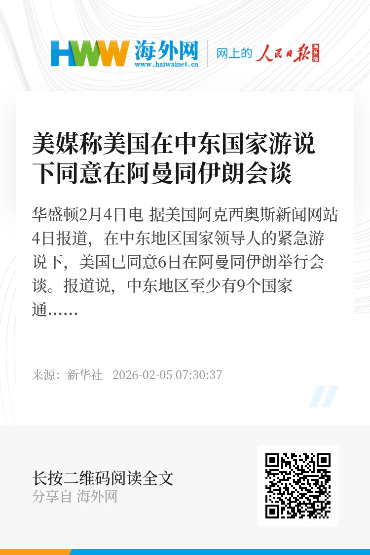 新华社华盛顿2月4日电 据美国阿克西奥斯新闻网站4日报道,在中东地区国家领导人的紧急游说下,美国已同意6日在阿曼同伊朗举行会谈。