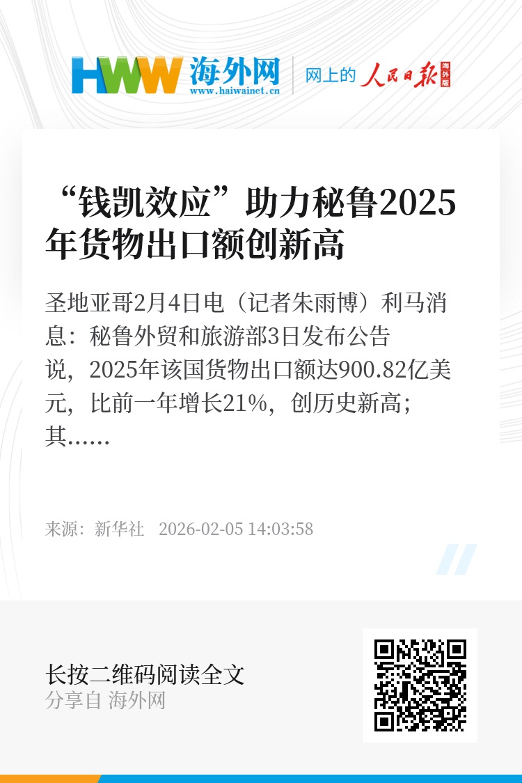 新华社圣地亚哥2月4日电(记者朱雨博)利马消息:秘鲁外贸和旅游部3日发布公告说,2025年该国货物出口额达900.82亿美元,比前一年增长21%,创历史新高;其中对中国出口额增长超30%,成为秘鲁全年货物出口增长的重要驱动力。