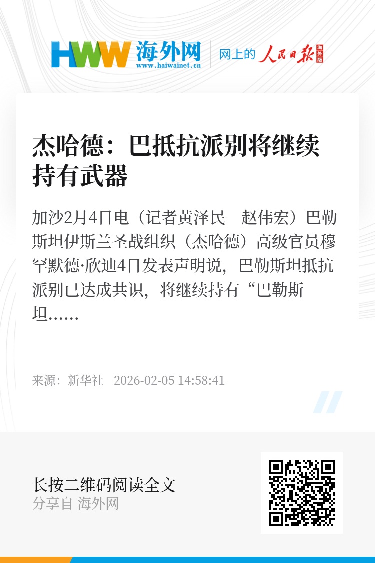 新华社加沙2月4日电(记者黄泽民 赵伟宏)巴勒斯坦伊斯兰圣战组织(杰哈德)高级官员穆罕默德·欣迪4日发表声明说,巴勒斯坦抵抗派别已达成共识,将继续持有“巴勒斯坦人民的武器”,同时在武器使用问题上向加沙停火斡旋方展现了灵活性。