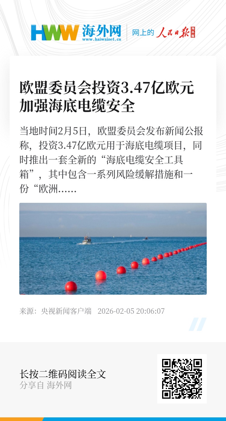 当地时间2月5日,欧盟委员会发布新闻公报称,投资3.47亿欧元用于海底电缆项目,同时推出一套全新的“海底电缆安全工具箱”,其中包含一系列风险缓解措施和一份“欧洲关注的海底电缆项目”清单。