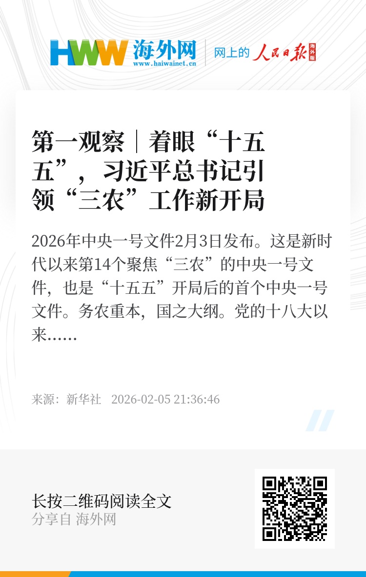 2026年中央一号文件2月3日发布。这是新时代以来第14个聚焦“三农”的中央一号文件,也是“十五五”开局后的首个中央一号文件。