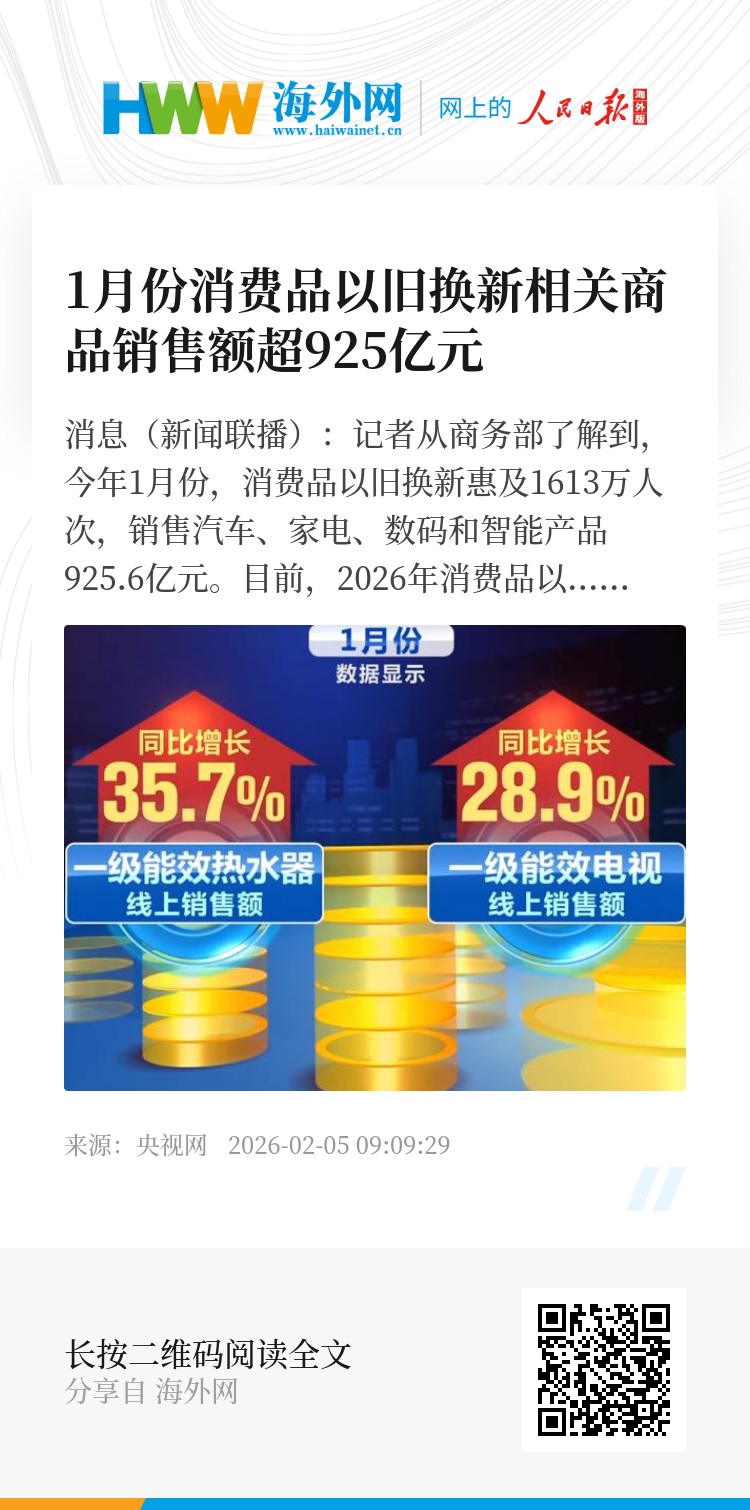 央视网消息(新闻联播):记者从商务部了解到,今年1月份,消费品以旧换新惠及1613万人次,销售汽车、家电、数码和智能产品925.6亿元。