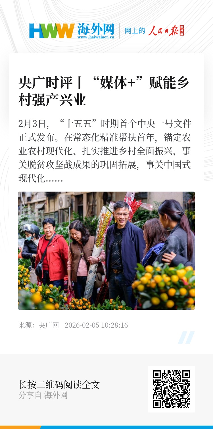 “十五五”开局之年,“媒体+”首度被写入广东省政府工作报告。报告称,过去一年,“媒体+”助力广东农产品品牌升级、销量攀升。从一株金玉满堂的年桔,到“粤字号”农产品群星闪耀,再到广东模式溢出跨域赋能,“媒体+”正以强大的策划推广、资源链接与品牌建设之力,赋能乡村产业拓市场、强品牌,为新时代乡村全面振兴写下生动注脚。(央广网特约评论员 秦川)