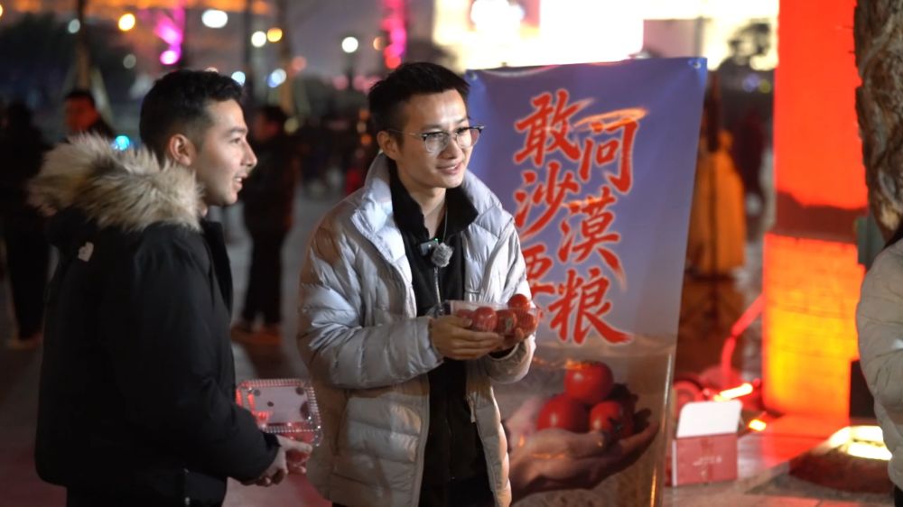 陈镇和他的朋友阿迪力·阿卜杜热合曼在西安大唐不夜城推广“喀柿红”