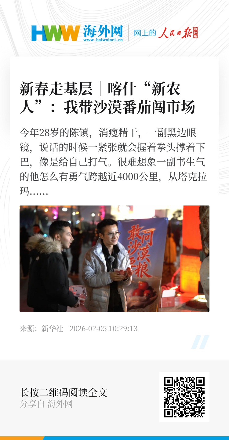 “现在‘喀柿红’网上销售好,可是未来新疆的沙漠里我们还有更多的高科技农产品需要转化,市场还是要脚踏实地去闯,去走!”陈镇说。他告诉记者,他有自己的五年计划,“死磕”在新疆南疆沙漠农业发展的事业中!