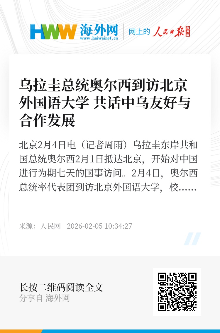 在文化与教育交流层面,奥尔西强调语言学习的核心是交流互鉴,而非机械运用。他表示,乌拉圭作为农业国家,深刻认识到教育、科技与创新是发展的核心动力,而乌中之间的文化交流、学术对话是增进理解的重要桥梁。