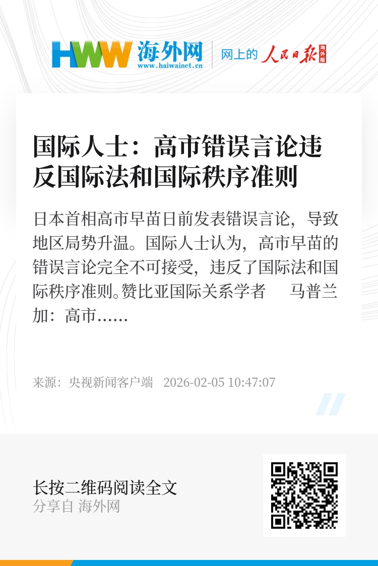 日本首相高市早苗日前发表错误言论,导致地区局势升温。国际人士认为,高市早苗的错误言论完全不可接受,违反了国际法和国际秩序准则。