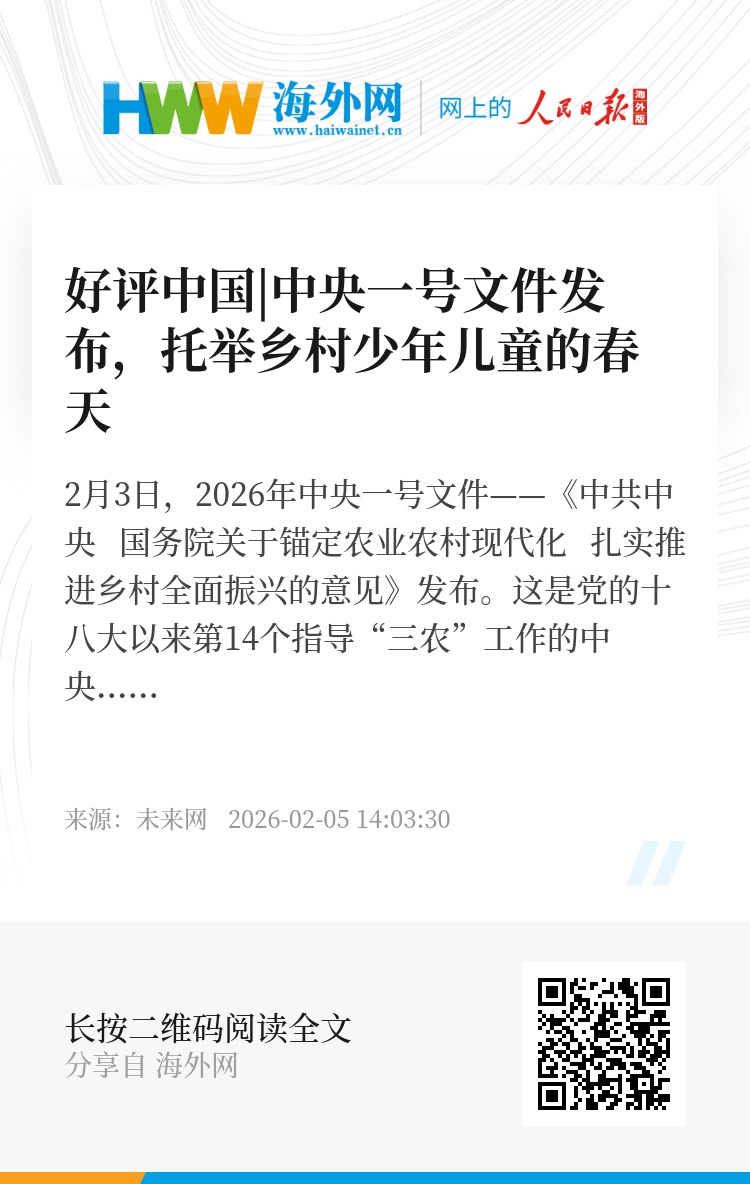 2月3日,2026年中央一号文件——《中共中央 国务院关于锚定农业农村现代化 扎实推进乡村全面振兴的意见》发布。这是党的十八大以来第14个指导“三农”工作的中央一号文件,也是“十五五”首个中央一号文件,不仅为“三农”工作擘画了清晰蓝图,也以较大篇幅对乡村少年儿童工作作出系统部署。