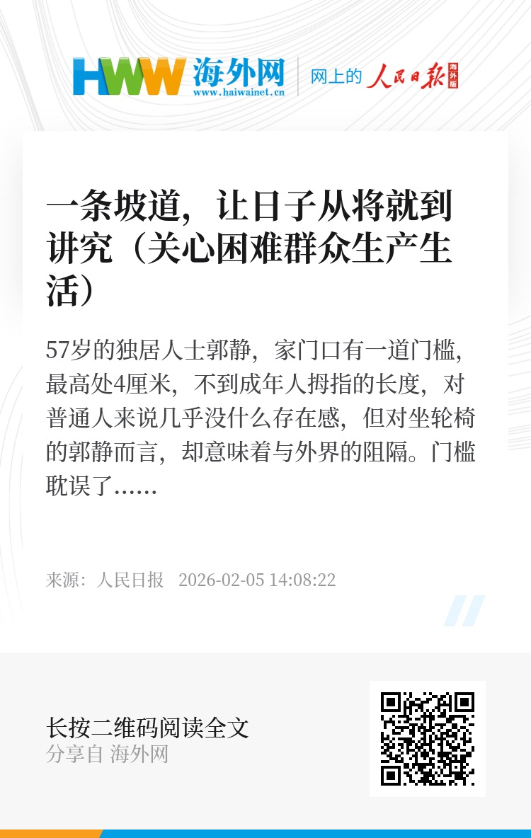 坡道表面的防滑纹,开始印下轮椅日复一日的轨迹。现在,郭静可以随时下楼扔垃圾,遇上老邻居,大家能聊上半天。“郭姐现在又能出来了,我们这栋楼的人气都更旺了。”一名邻居说。