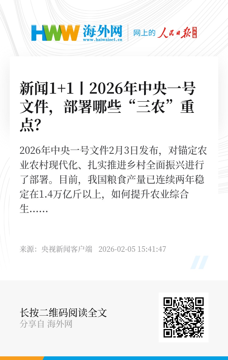 2026年中央一号文件2月3日发布,对锚定农业农村现代化、扎实推进乡村全面振兴进行了部署。目前,我国粮食产量已连续两年稳定在1.4万亿斤以上,如何提升农业综合生产能力和质量效益成为重中之重。除了稳定发展粮油生产,文件明确提出加强农业关键核心技术攻关和科技成果高效转化应用。与此同时,文件将实施常态化精准帮扶单独列为一项重要工作任务,强调要培育壮大县域富民产业、促进农民工稳岗就业。保障粮食安全如何再升级?现代农业科技要如何提高效能?常态化精准帮扶机制如何有效建立?《新闻1+1》本期节目连线中国农业科学院农业经济与发展研究所所长胡向东,进行解读。