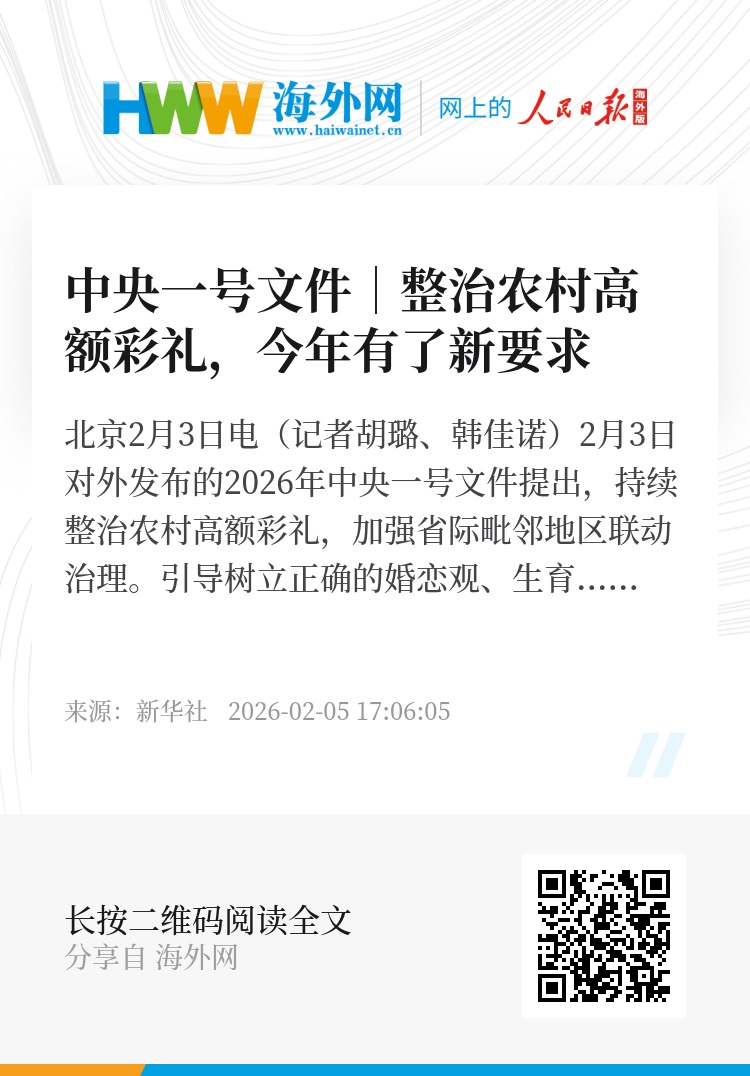 新华社北京2月3日电(记者胡璐、韩佳诺)2月3日对外发布的2026年中央一号文件提出,持续整治农村高额彩礼,加强省际毗邻地区联动治理。引导树立正确的婚恋观、生育观、家庭观,培育简约文明的婚俗文化。