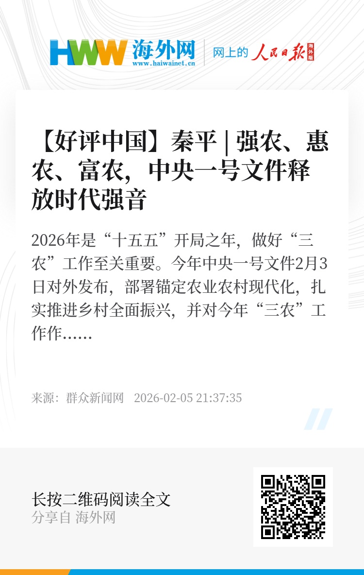 2026年是“十五五”开局之年,做好“三农”工作至关重要。今年中央一号文件2月3日对外发布,部署锚定农业农村现代化,扎实推进乡村全面振兴,并对今年“三农”工作作出明确要求,释放出强农、惠农、富农的时代强音。