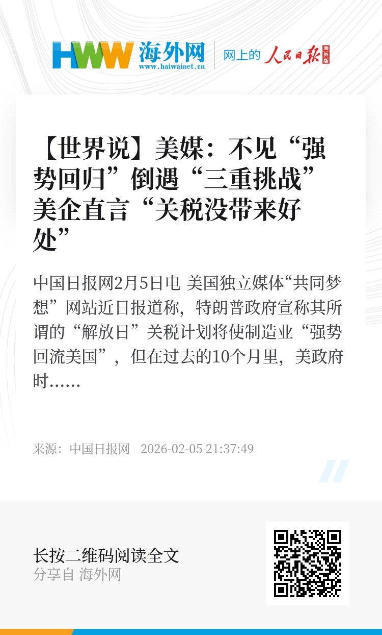 中国日报网2月5日电 美国独立媒体“共同梦想”网站近日报道称,特朗普政府宣称其所谓的“解放日”关税计划将使制造业“强势回流美国”,但在过去的10个月里,美政府时而提高关税,时而又取消,时而还威胁征收新关税。如此背景下,美国制造业近年来取得的任何进展都“出现了倒退”。