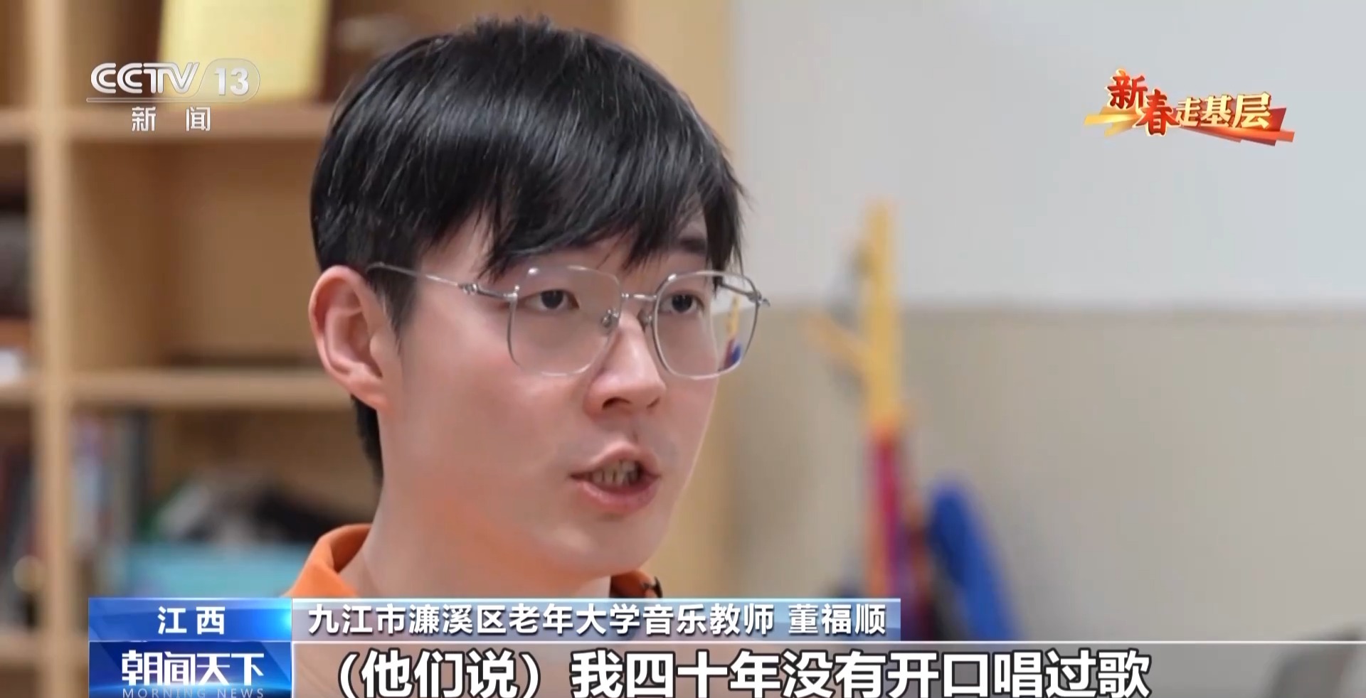 九江市濂溪区老年大学音乐教师 董福顺:我去了之后,他们说我四十年没有开口唱过歌,已经很久很久,他们说都快忘了这首歌的歌词了,你过来了,让我想起了它。所以我觉得我又一次被认可了,我也觉得是他们在给我一点能量,当看着他们唱回忆起的这些歌曲的时候,他们坐直了,开始朝我挥手去唱,我觉得这件事做对了。