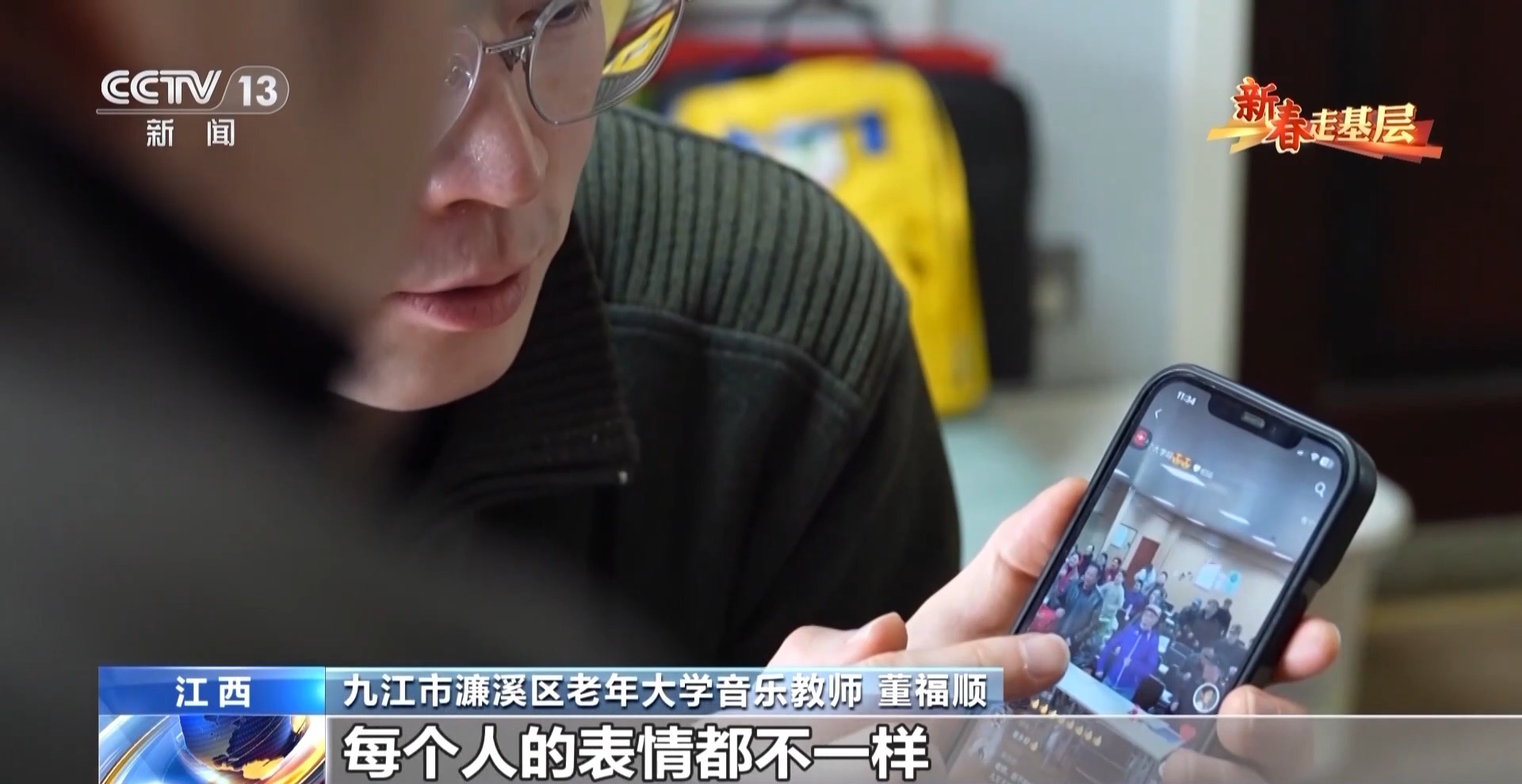 九江市濂溪区老年大学音乐教师 董福顺:这些叔叔阿姨们很可爱,每个人的表情都不一样,然后还有捣乱的,别人都在认真做作业他要去摸别人一下。最初发这个视频,就是想让老年人回到家里跟着练。然后发着发着网友就开始叫“大型认亲现场”,然后就开始嘱咐,“老师能不能晚点放学,不然又回来念叨”。然后你看,“都挺好,给我爸爸报上”,其实你看都是在关心自己的长辈,我们其实都想去对父母说我爱你,但是中国人很含蓄,所以在这里边我看到了这一点。