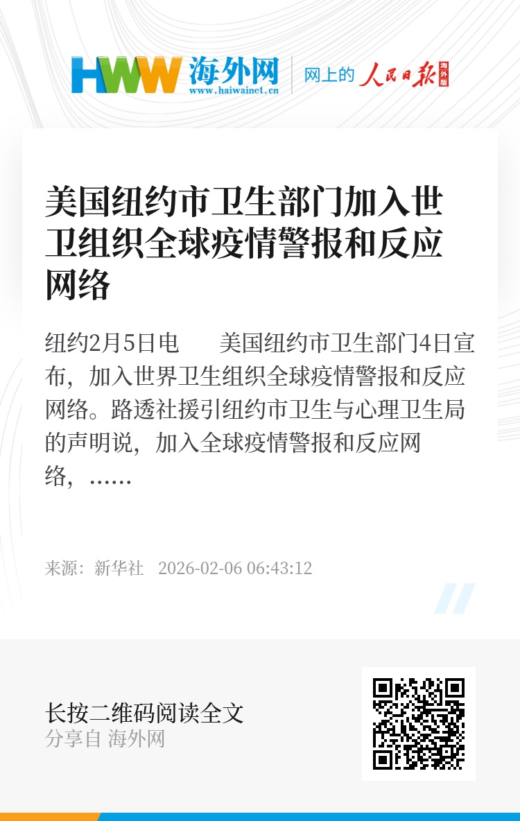 新华社纽约2月5日电 美国纽约市卫生部门4日宣布,加入世界卫生组织全球疫情警报和反应网络。