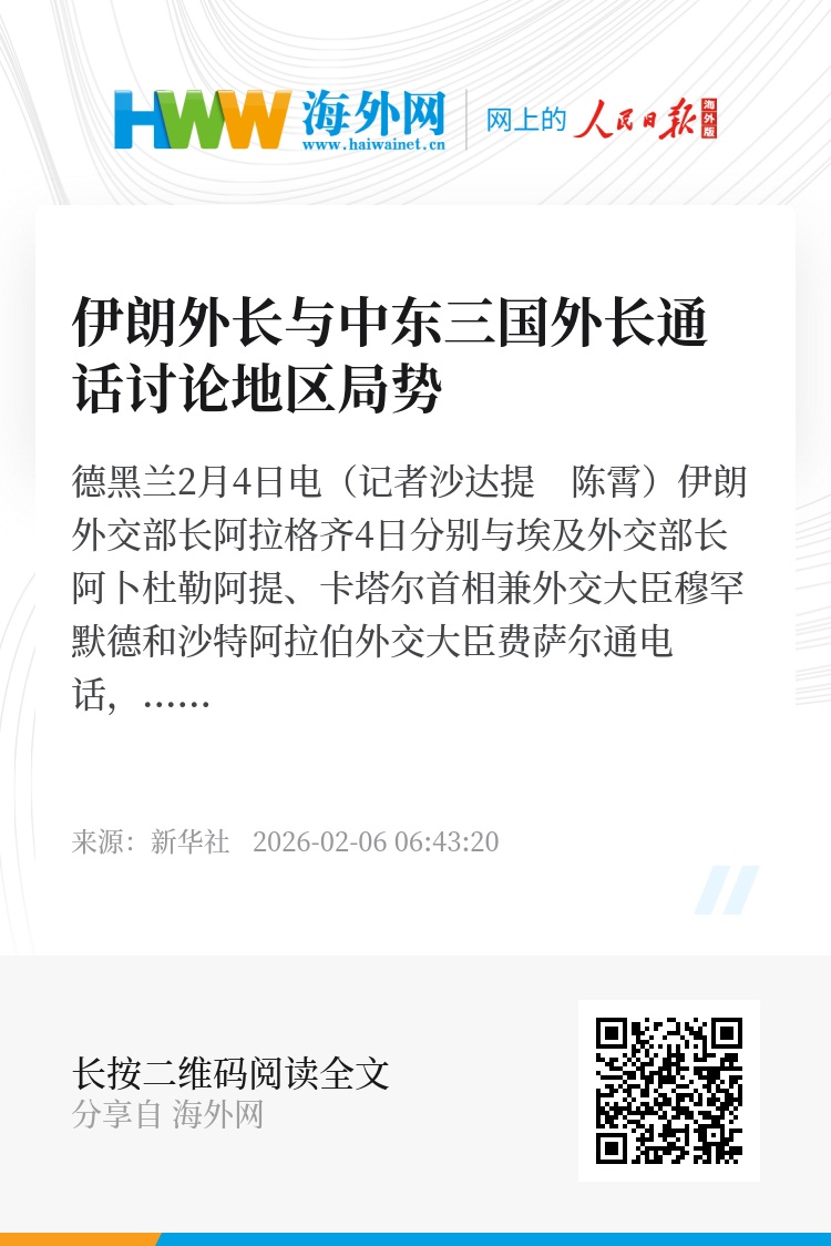 新华社德黑兰2月4日电(记者沙达提 陈霄)伊朗外交部长阿拉格齐4日分别与埃及外交部长阿卜杜勒阿提、卡塔尔首相兼外交大臣穆罕默德和沙特阿拉伯外交大臣费萨尔通电话,讨论地区局势。