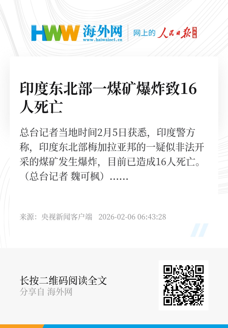 总台记者当地时间2月5日获悉,印度警方称,印度东北部梅加拉亚邦的一疑似非法开采的煤矿发生爆炸,目前已造成16人死亡。(总台记者 魏可枫)