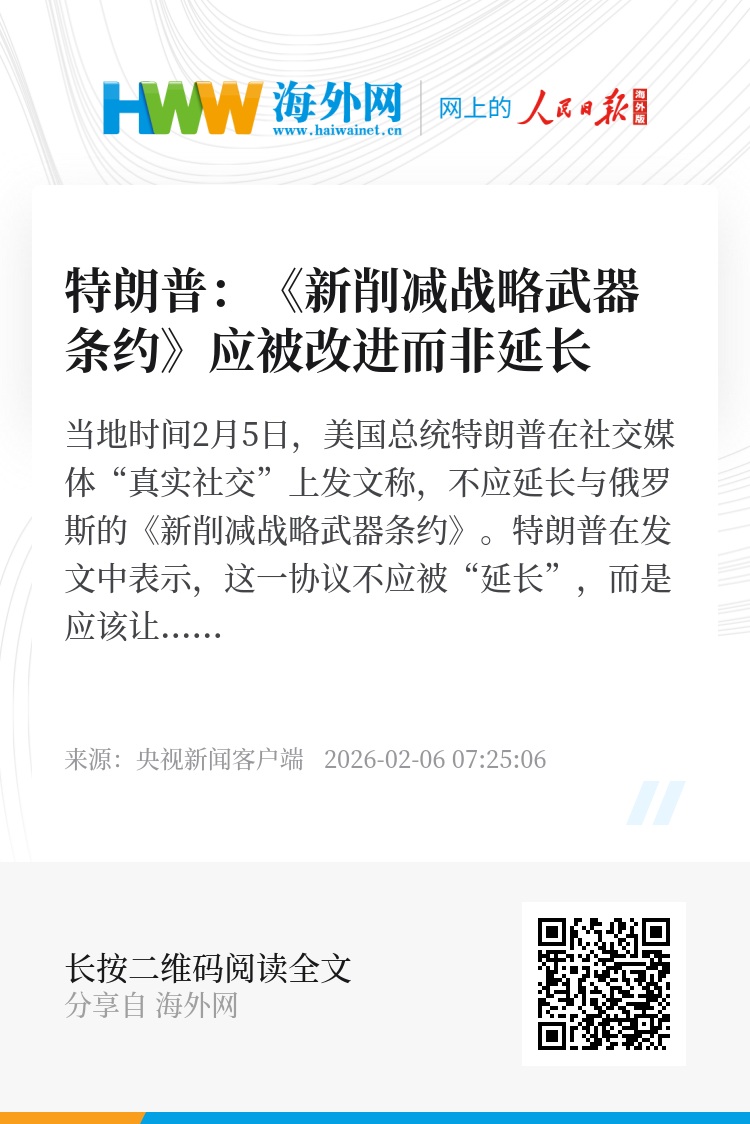 当地时间2月5日,美国总统特朗普在社交媒体“真实社交”上发文称,不应延长与俄罗斯的《新削减战略武器条约》。特朗普在发文中表示,这一协议不应被“延长”,而是应该让美国的核问题专家制定一项“新的、改进的、现代化的条约”。