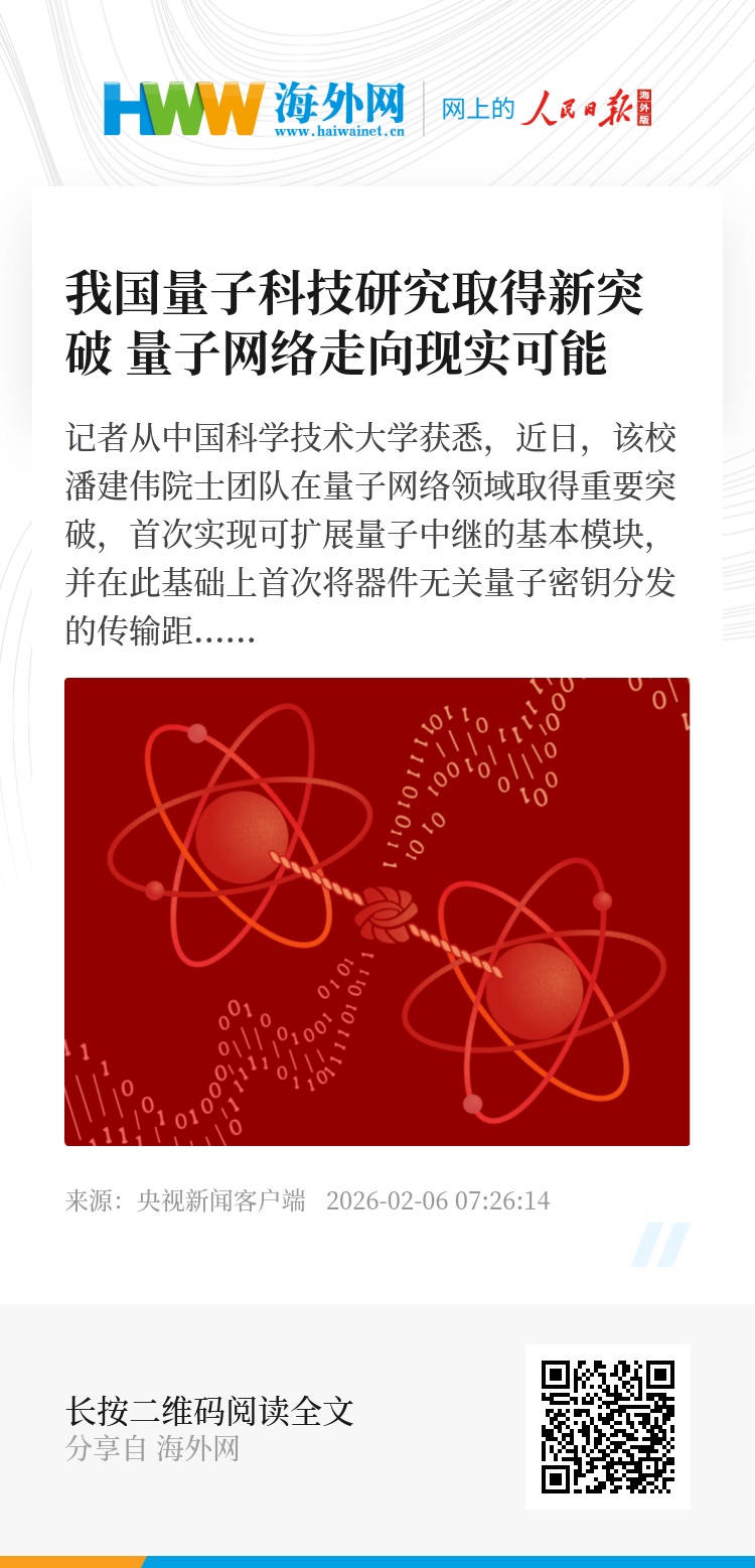 记者从中国科学技术大学获悉,近日,该校潘建伟院士团队在量子网络领域取得重要突破,首次实现可扩展量子中继的基本模块,并在此基础上首次将器件无关量子密钥分发的传输距离突破百公里。相关成果分别于3日和6日在国际学术期刊《自然》和《科学》发表。